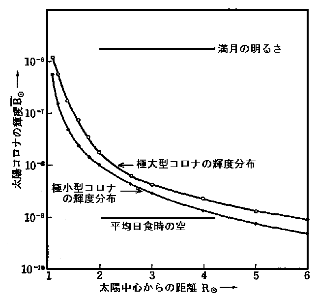 横軸の単位は太陽の半径。つまりグラフの一番左端が太陽の縁になります。縦軸の単位は太陽表面の平均輝度。対数表示なので、1目盛りで10倍、2目盛りで100倍違う事になります。1Rのところと5Rのところでは1000倍も明るさが違うことがわかります。(「天体写真技術」P82、地人書館、昭和44年より)
